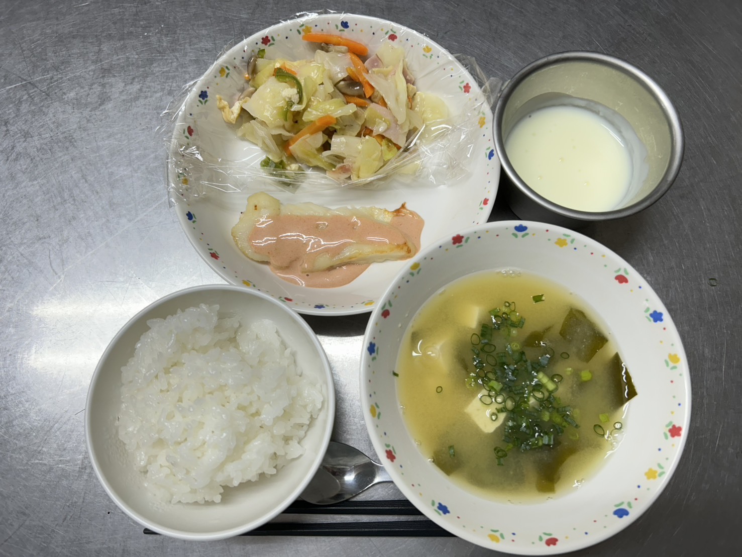 10月1日 御飯、魚のオーロラソース、野菜とベーコンのソテー、みそ汁、ヨーグルト