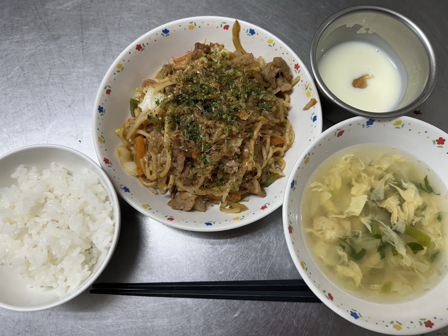 10月2日 御飯、焼きそば、わかめと卵のスープ、ジャムヨーグルト