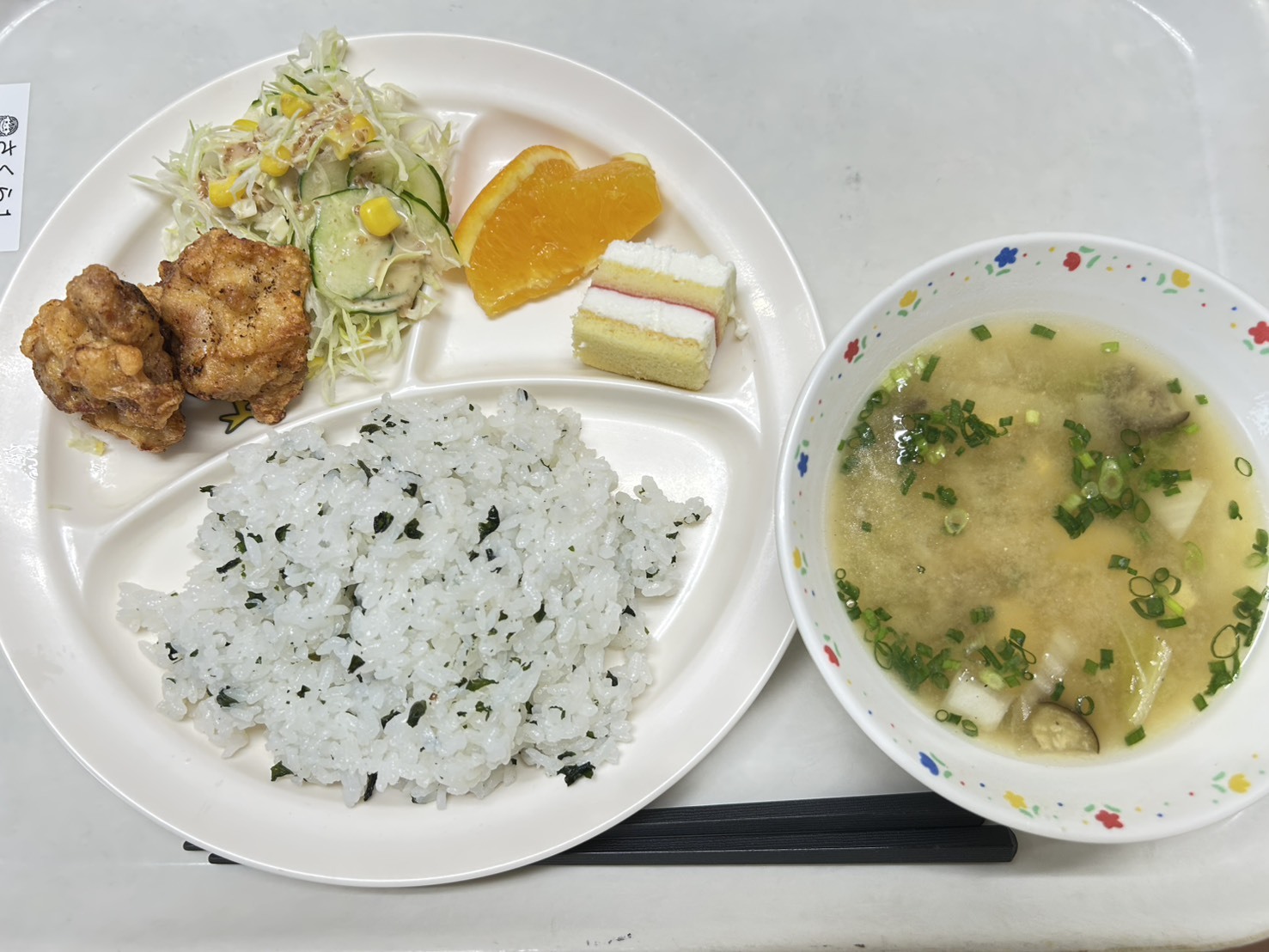 10月7日 わかめ御飯、鶏の唐揚げ、生野菜(チーズ)、みそ汁、オレンジ、ミニケーキ