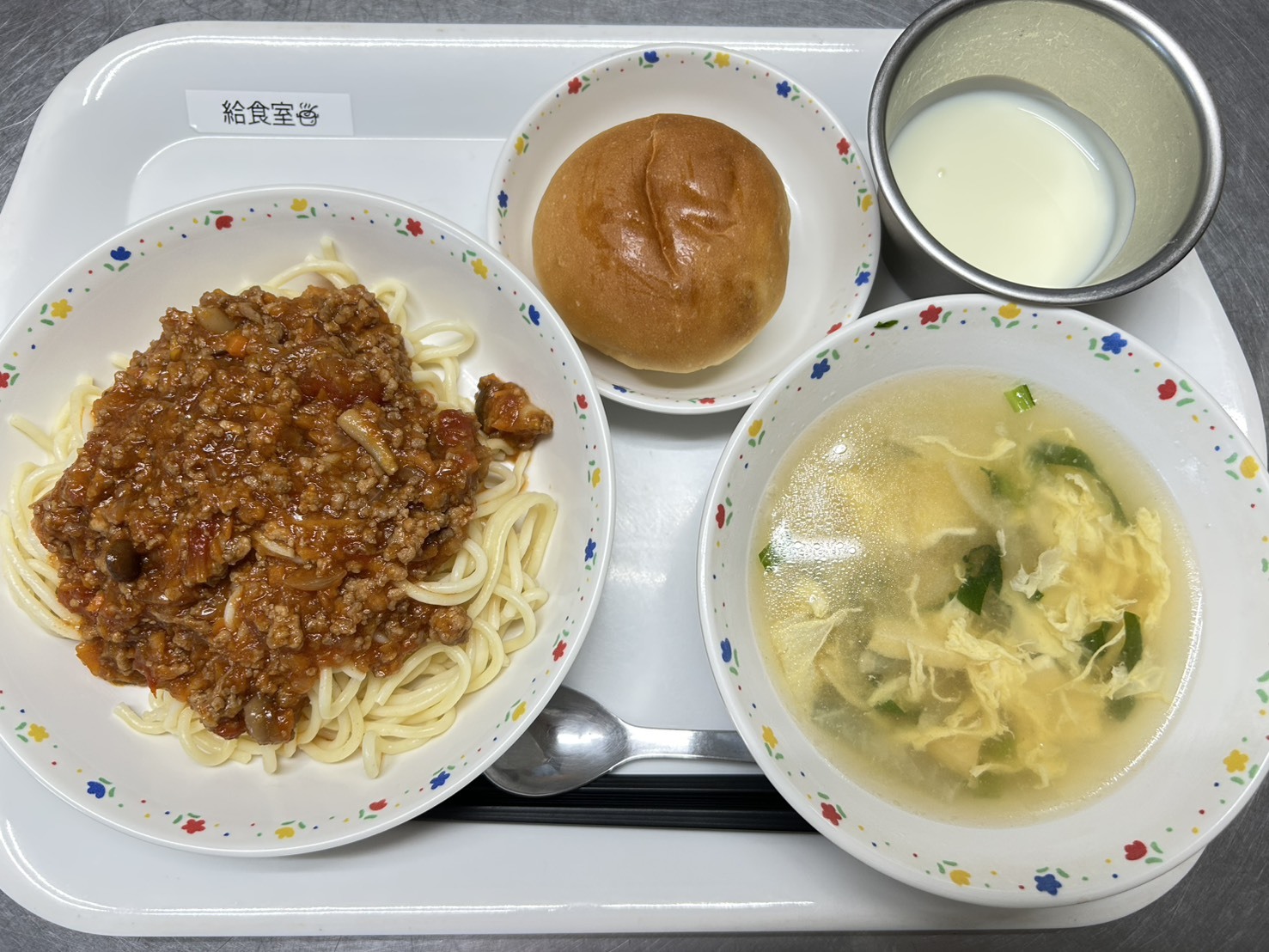 10月14日 コッペパン、ミートスパゲティー、卵と野菜のスープ、ヨーグルト