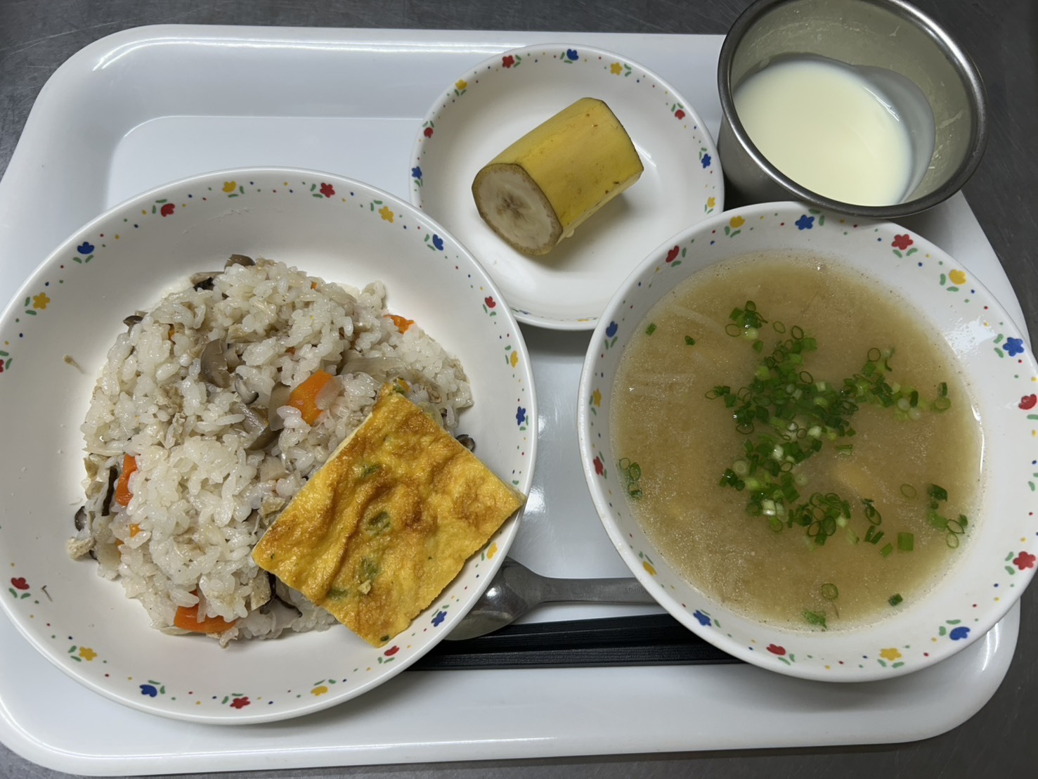 10月15日 きのこの炊き込みご飯、ほうれん草のオムレツ、みそ汁、ヨーグルト、バナナ