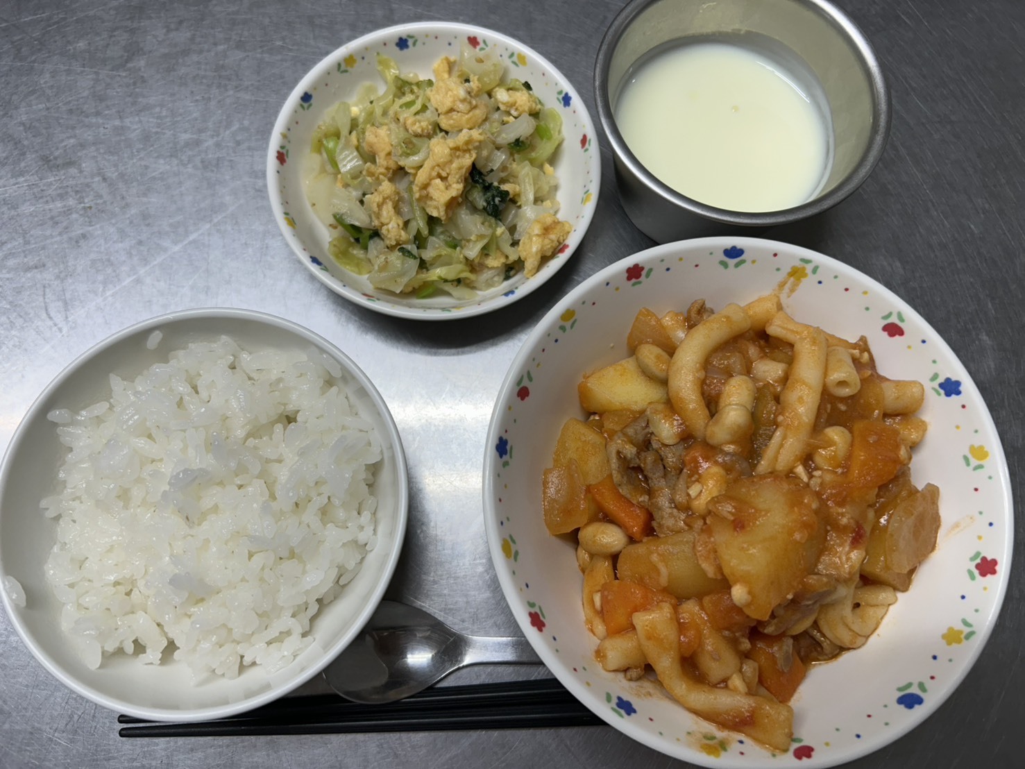 10月20日 御飯、ポークビーンズ、キャベツと卵のごま和え、ヨーグルト