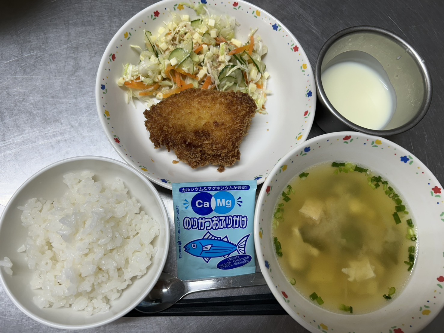 10月21日 御飯、カルシウムふりかけ、魚のフライ、チーズサラダ、みそ汁、ヨーグルト