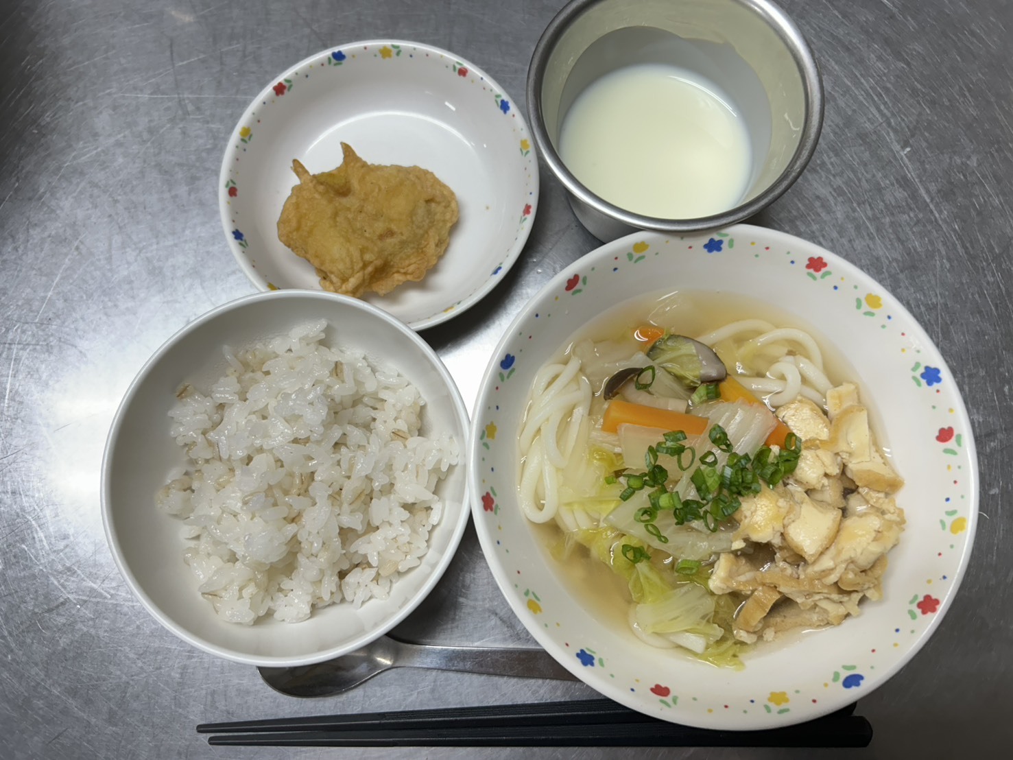 11月17日 麦御飯、きのこのうどん、さつま芋の天ぷら、ヨーグルト