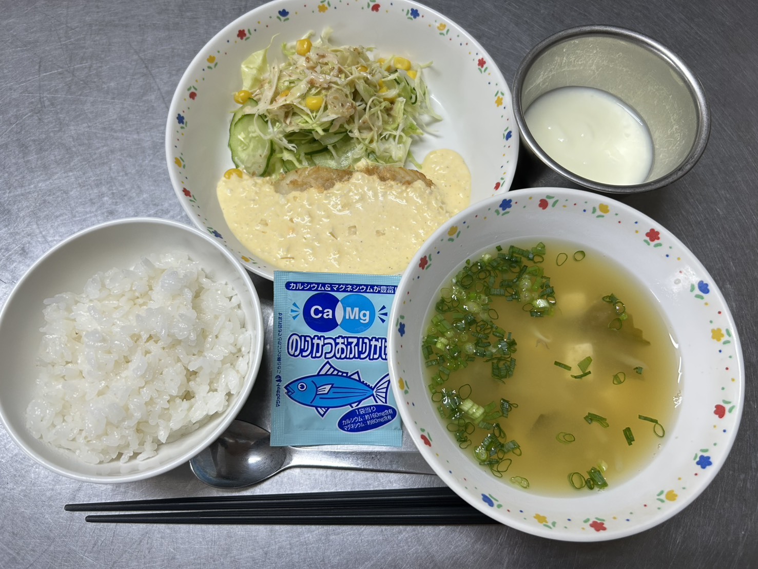11月19日 御飯、カルシウムふりかけ、魚のタルタルソース、生野菜、みそ汁、ヨーグルト