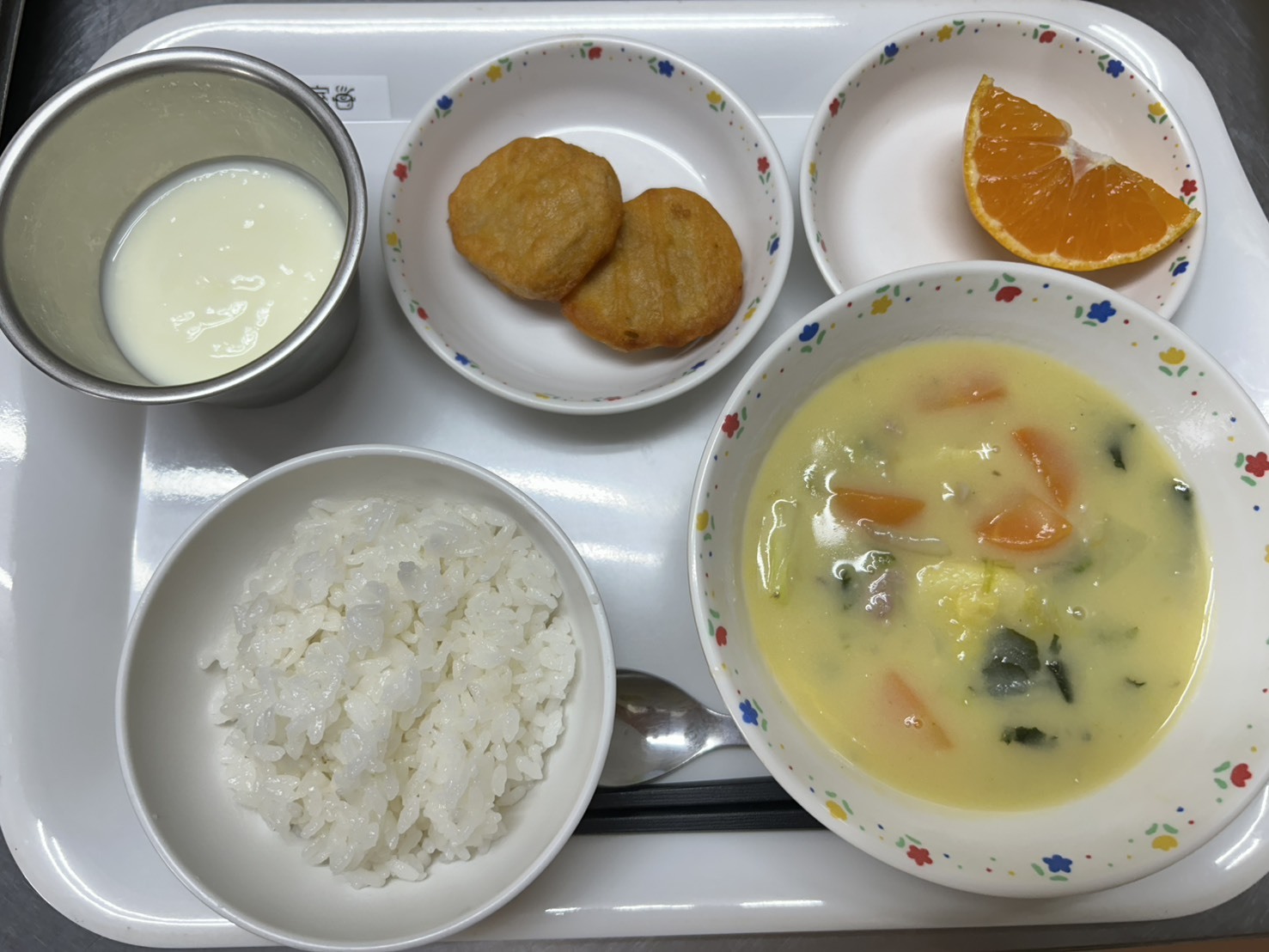 11月20日 御飯、クリームシチュー(秋冬野菜)、チキンナゲット、ヨーグルト、みかん