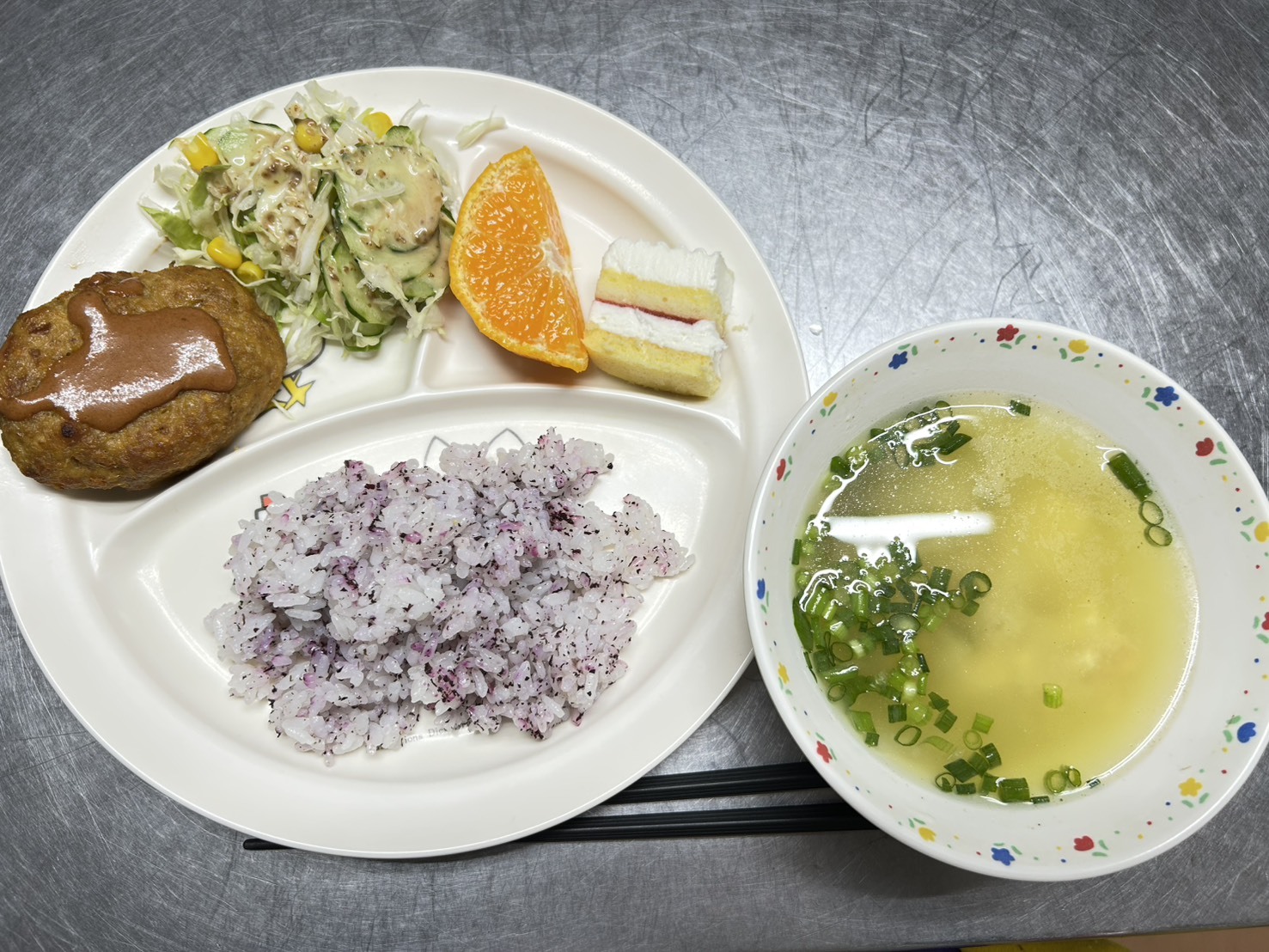 12月2日 ゆかり御飯、ハンバーグ、生野菜、みそ汁、ミニケーキ、みかん