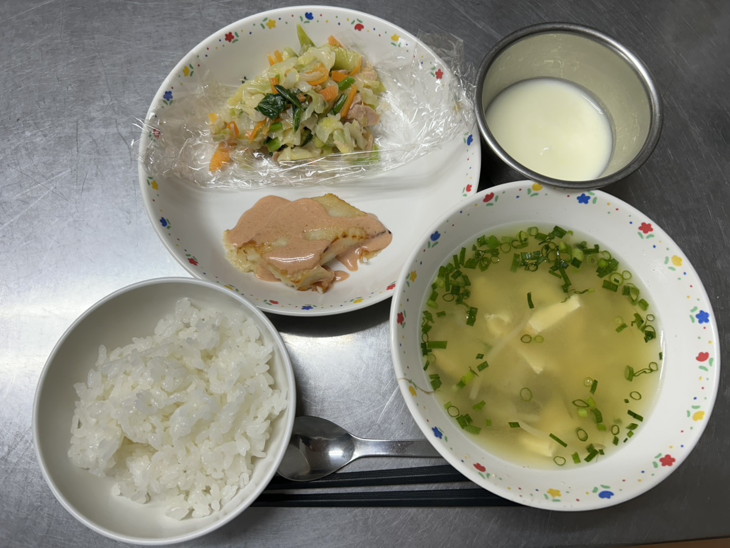 12月3日 御飯、魚のオーロラソース、小松菜とツナの和え物、みそ汁、ヨーグルト