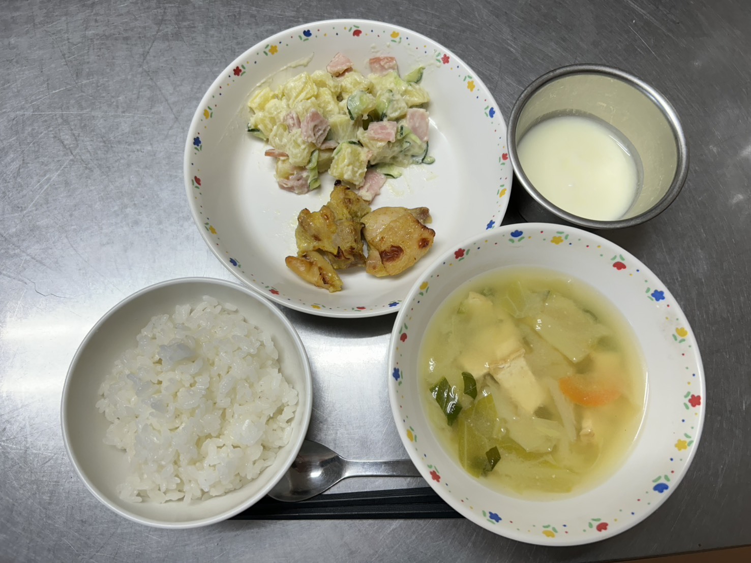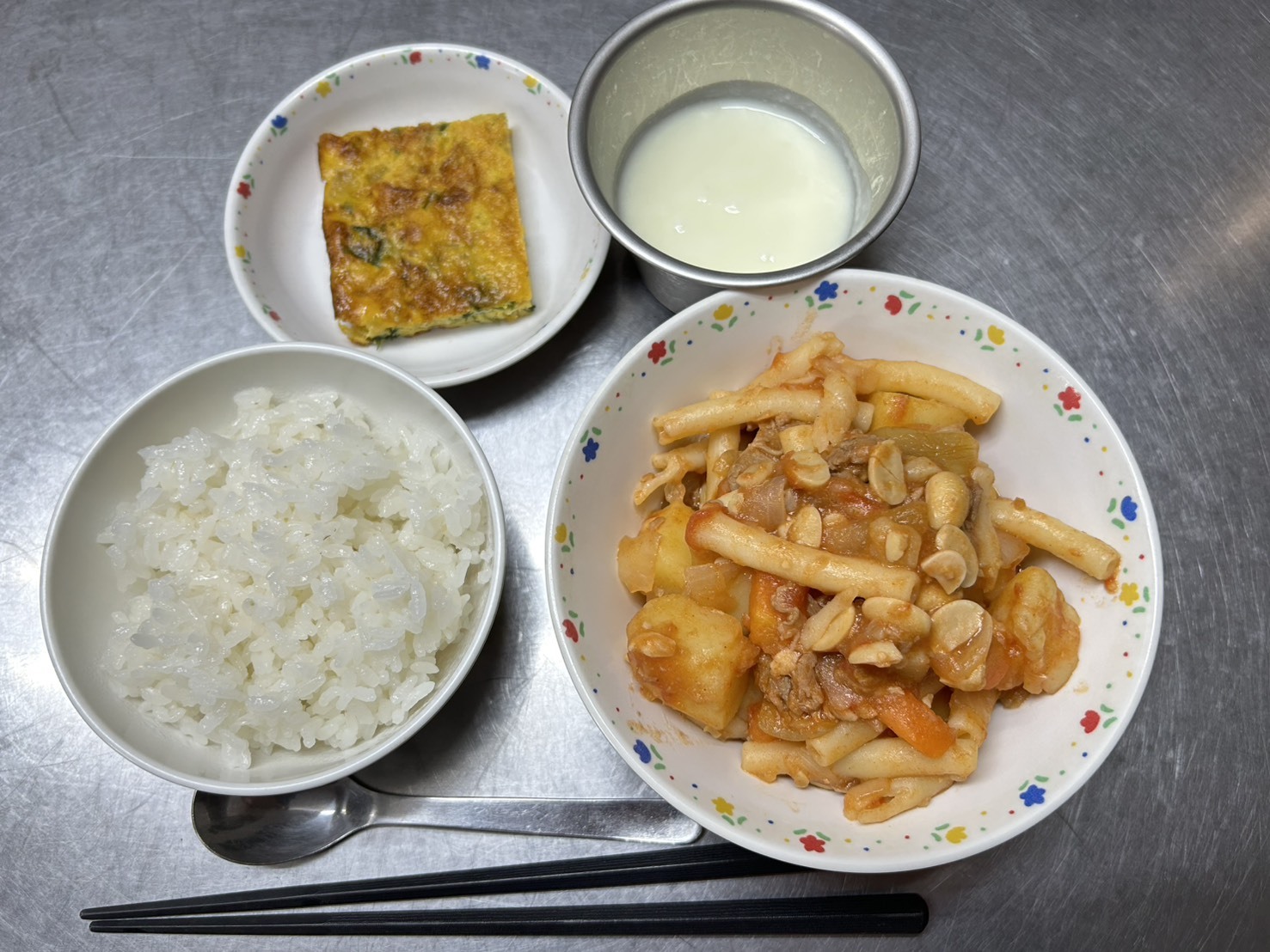 12月4日 御飯、鶏肉のカレー風味焼き、さつまいもサラダ、みそ汁、ヨーグルト