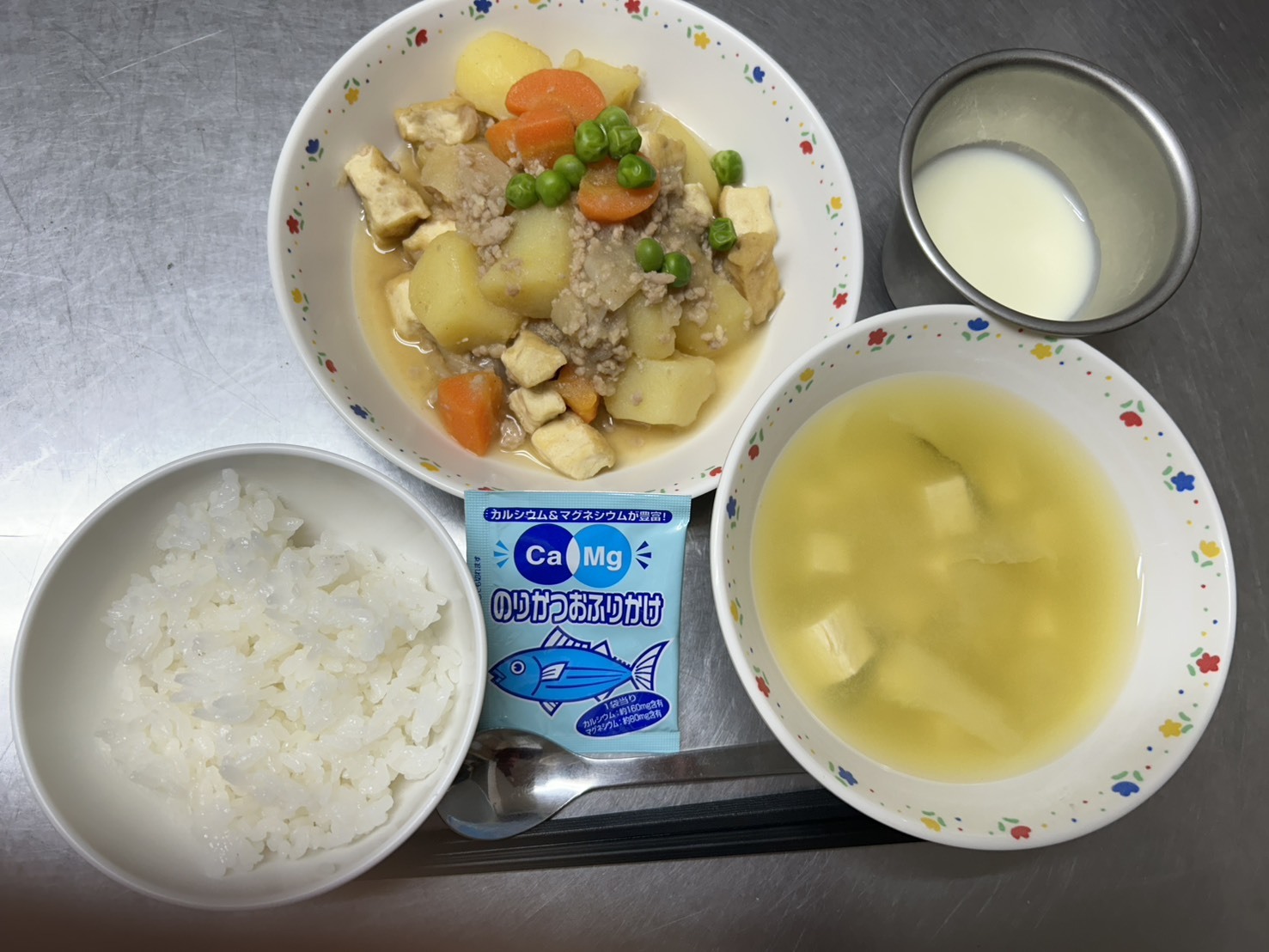 11月22日 御飯、カルシウムふりかけ、厚揚げとじゃが芋のそぼろ煮、みそ汁、ヨーグルト