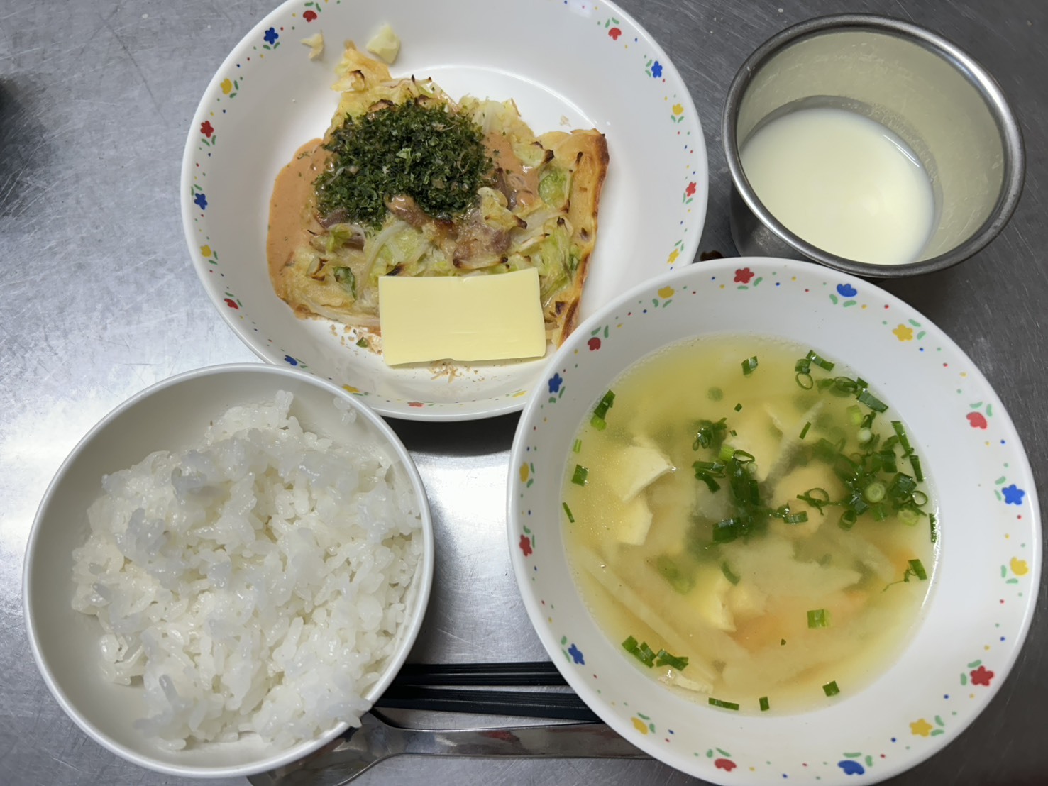 11月26日 御飯、お好み焼き、チーズ、みそ汁、ヨーグルト