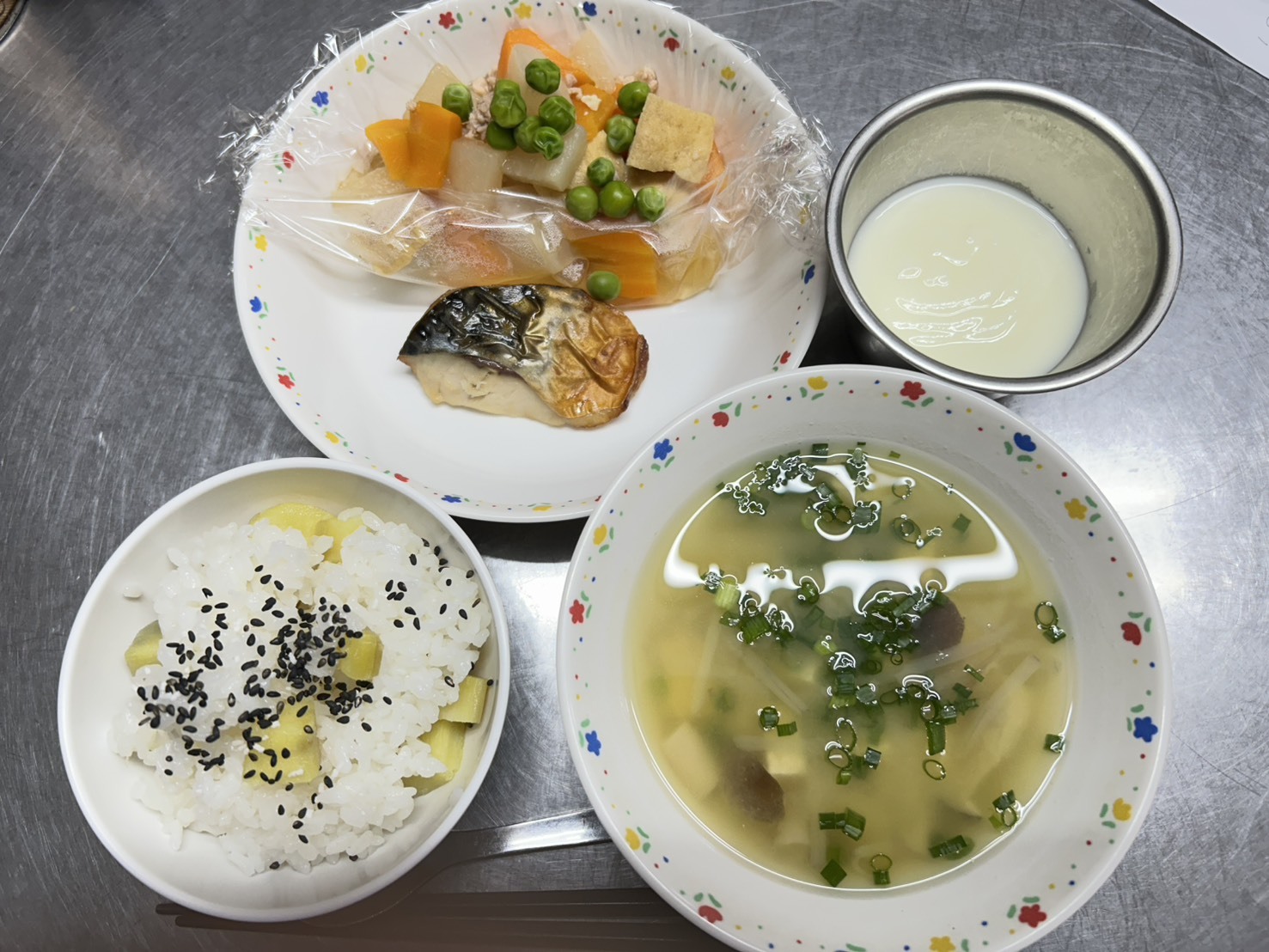 11月27日 さつま芋御飯、魚の塩焼き、大根のそぼろ煮、みそ汁、ヨーグルト