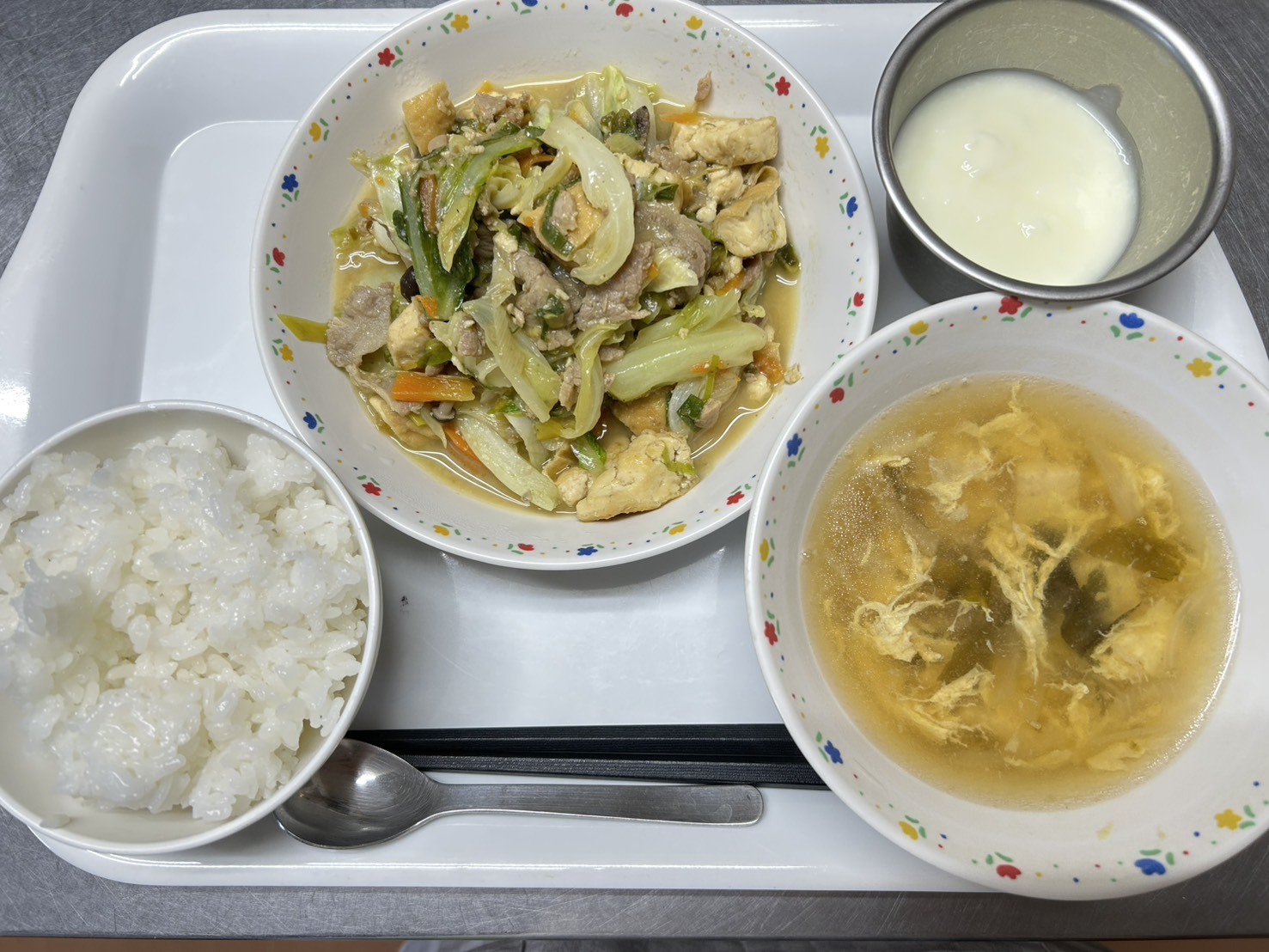 11月29日 御飯、豚肉とキャベツのみそ炒め、卵とわかめのスープ、ヨーグルト