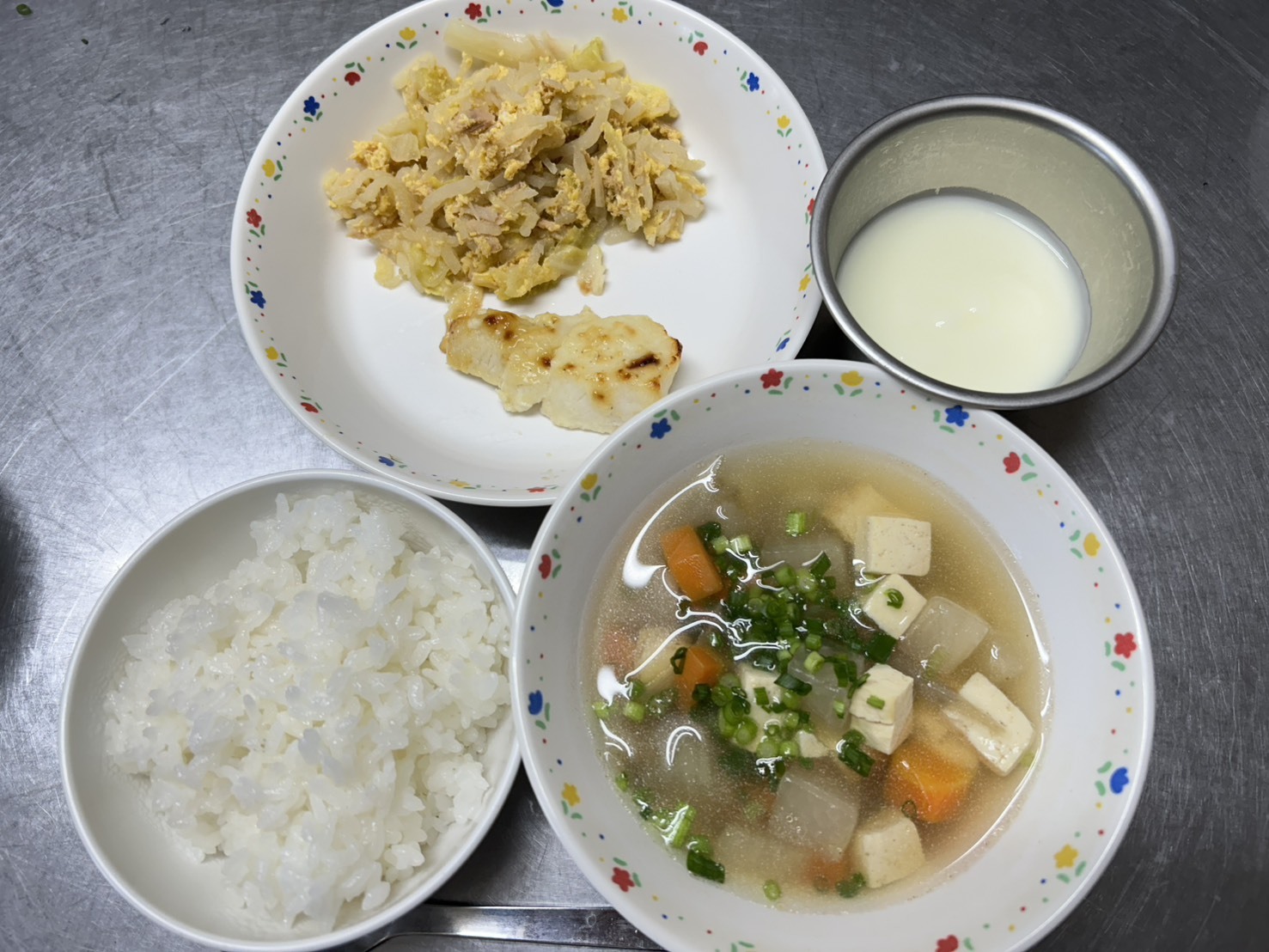 12月16日 御飯、魚のみそマヨネーズ焼き、切干大根とツナの卵とじ、けんちん汁、ヨーグルト