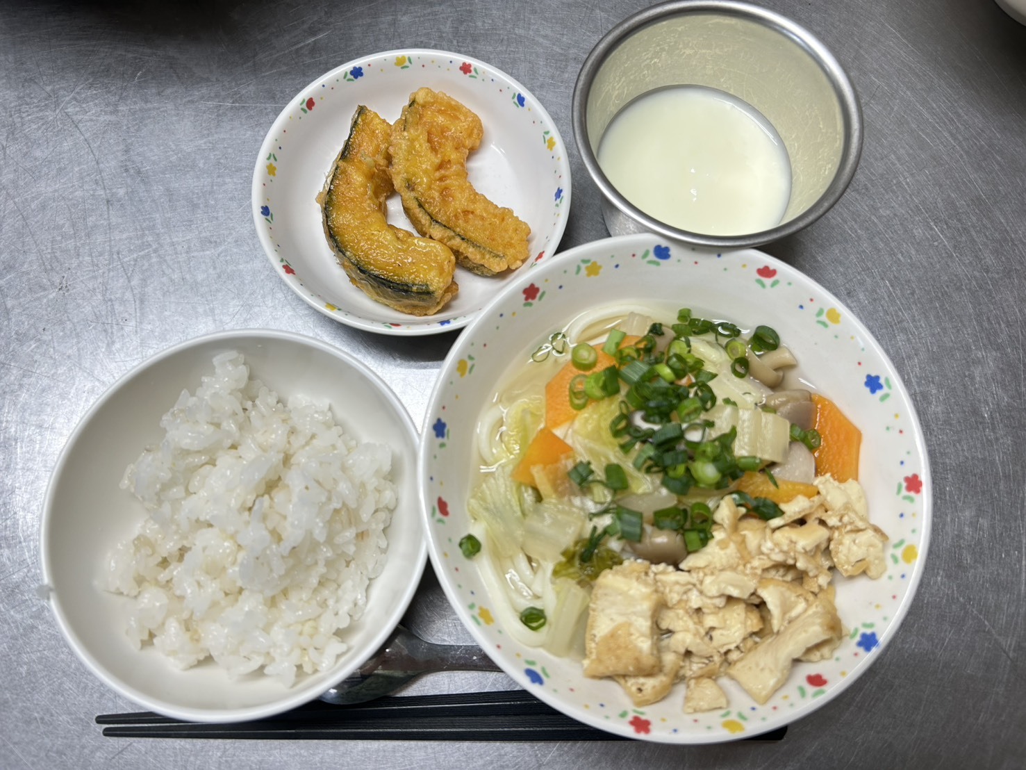 1月29日 麦御飯、きのこのうどん、かぼちゃの天ぷら、ヨーグルト