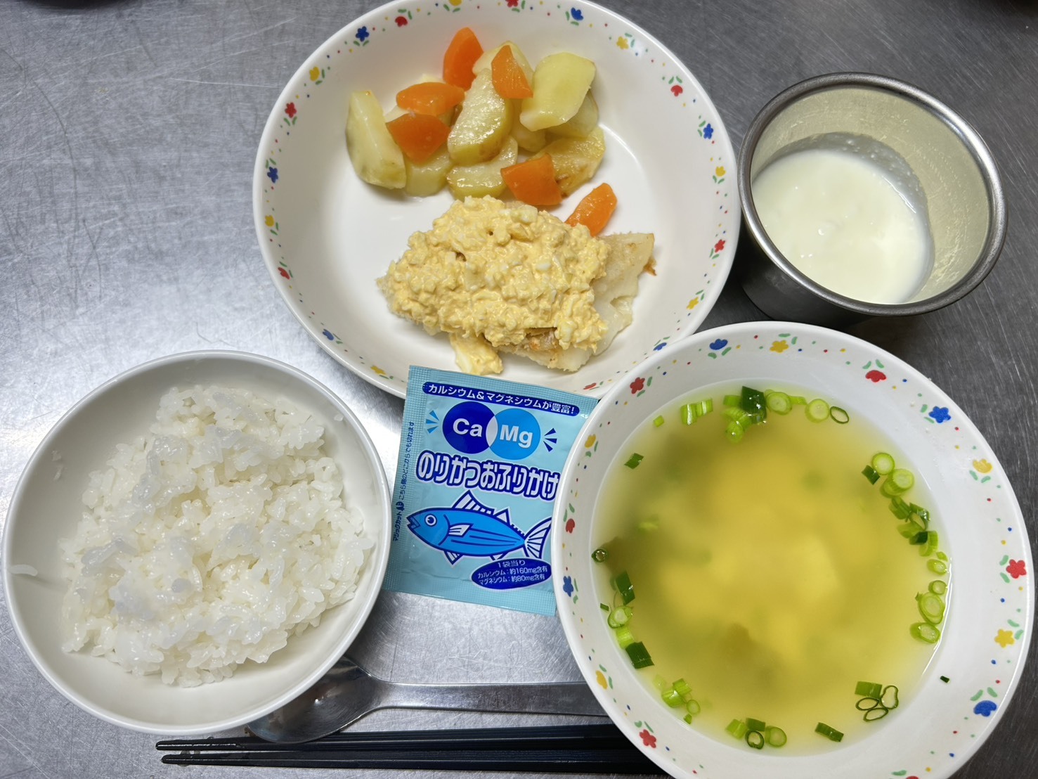 1月30日 御飯、カルシウムふりかけ、魚のタルタルソース、焼きポテト・焼きにんじん、みそ汁、ヨーグルト