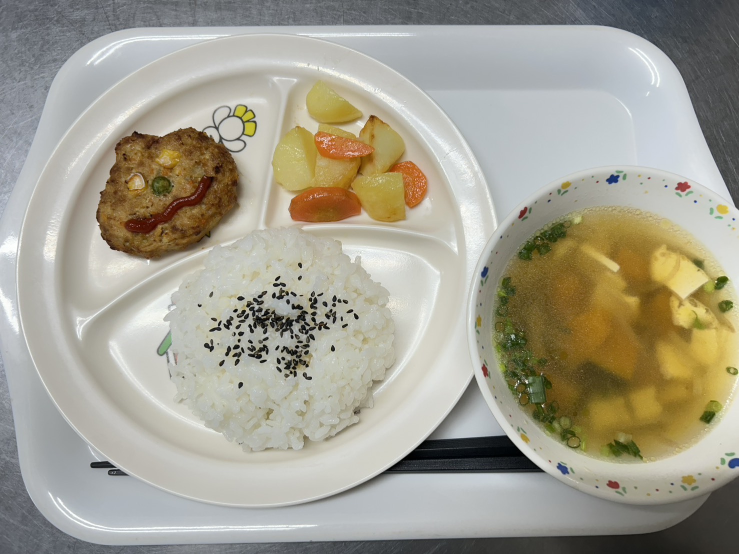 10月29日 御飯(ごま塩)、ハロウィンハンバーグ、焼きポテト・焼きにんじん、コンソメスープ