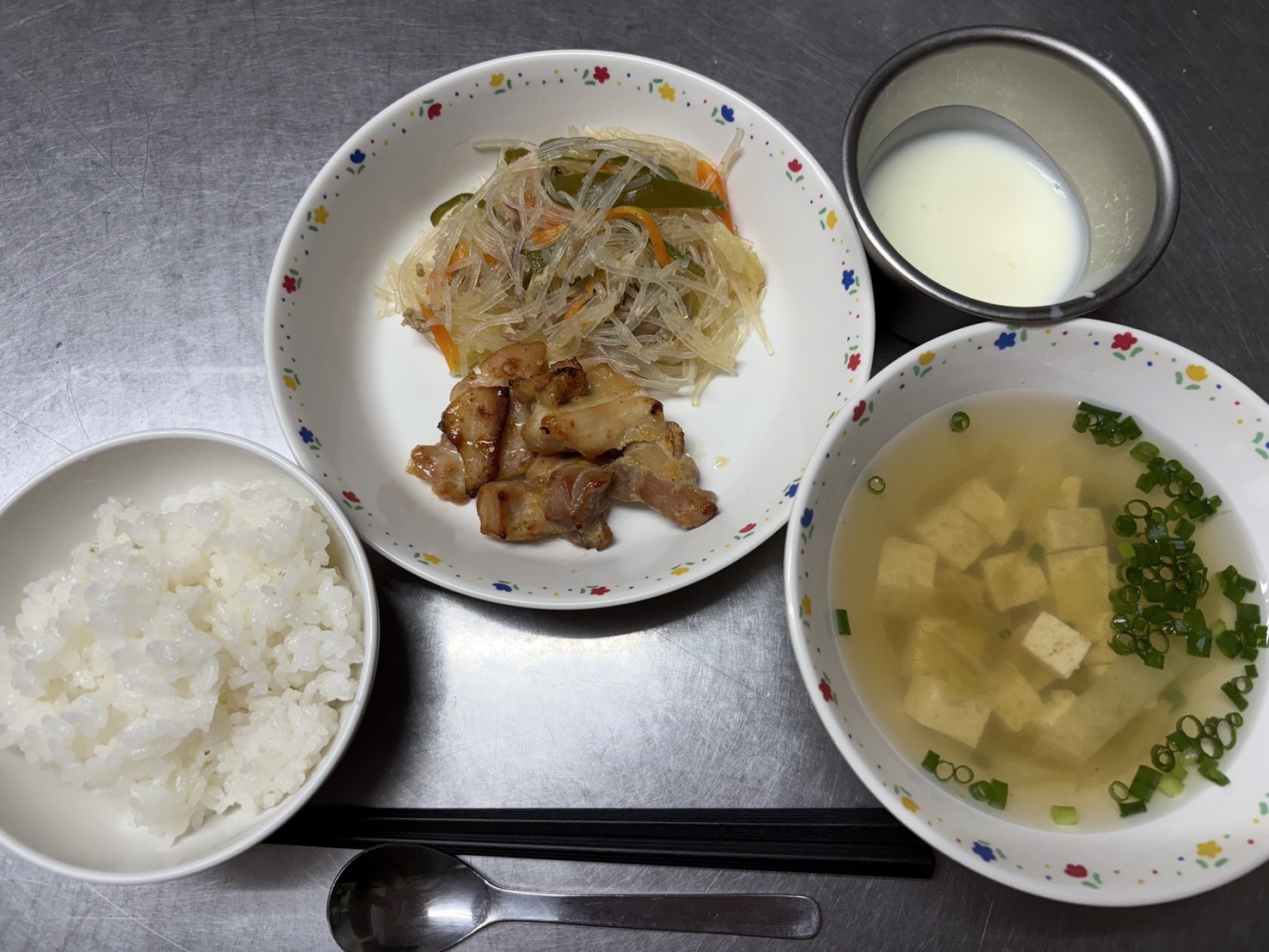 10月31日 御飯、鶏肉のみそ焼き、春雨と野菜のソテー、すまし汁、ヨーグルト