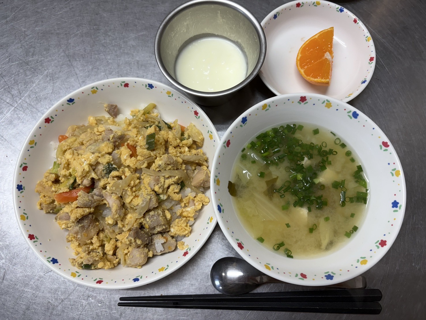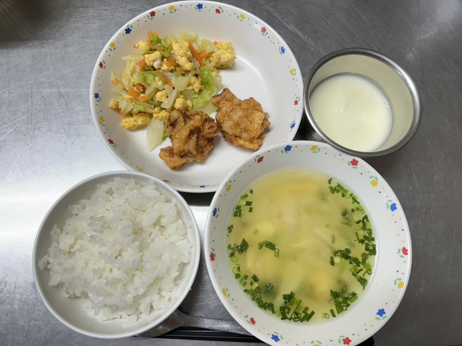 12月23日 御飯、鶏の唐揚げ、キャベツと炒り卵のナムル、みそ汁、ヨーグルト