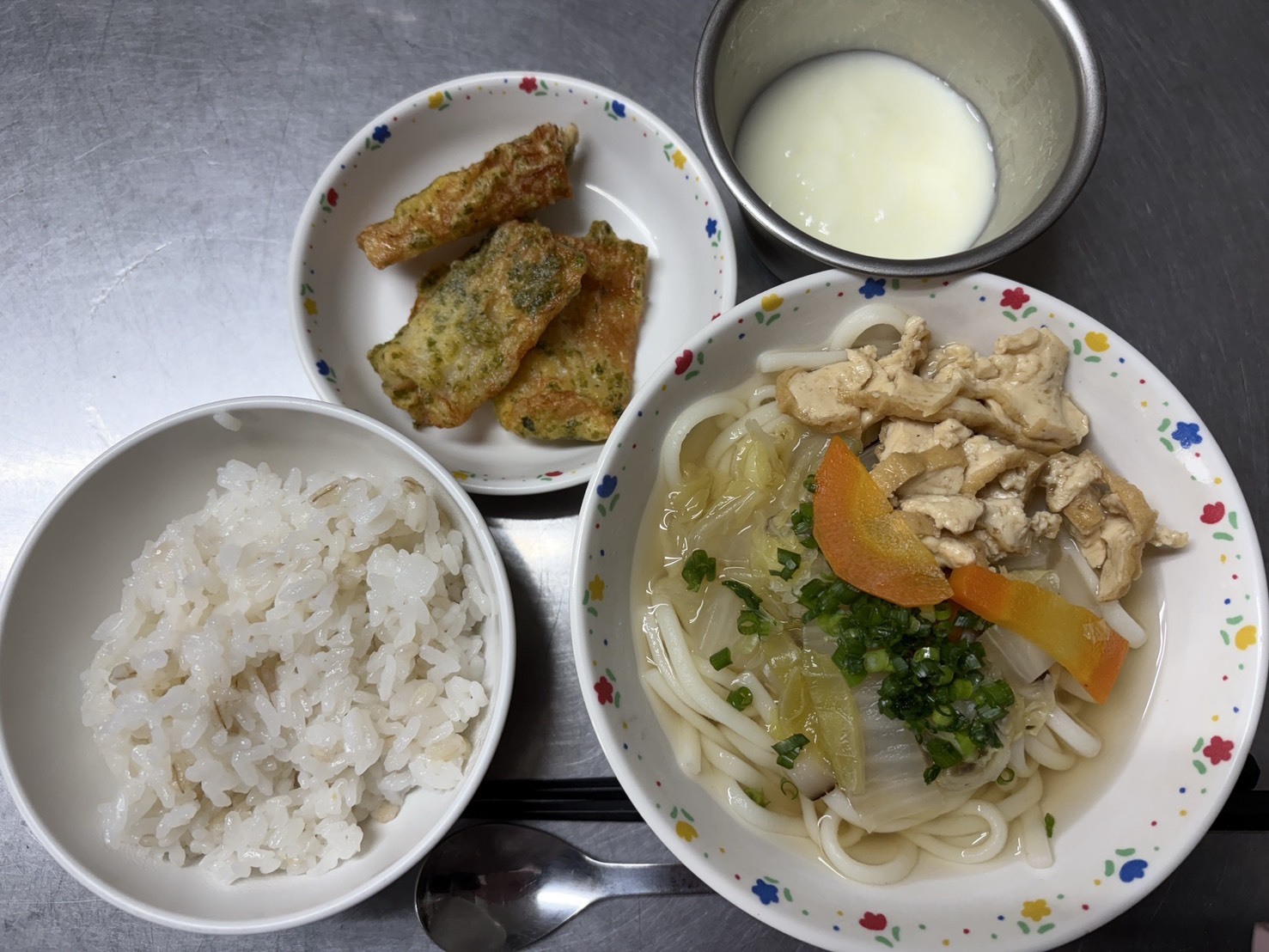 12月19日 麦御飯、きつねうどん、ちくわの磯辺揚げ、ヨーグルト