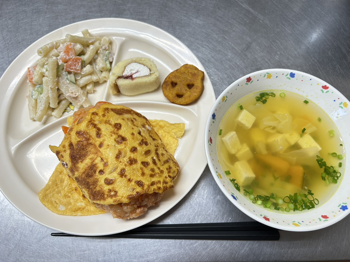 12月22日 オムライス、マカロニサラダ、あんぱんまんポテト、コンソメスープ、ミニケーキ