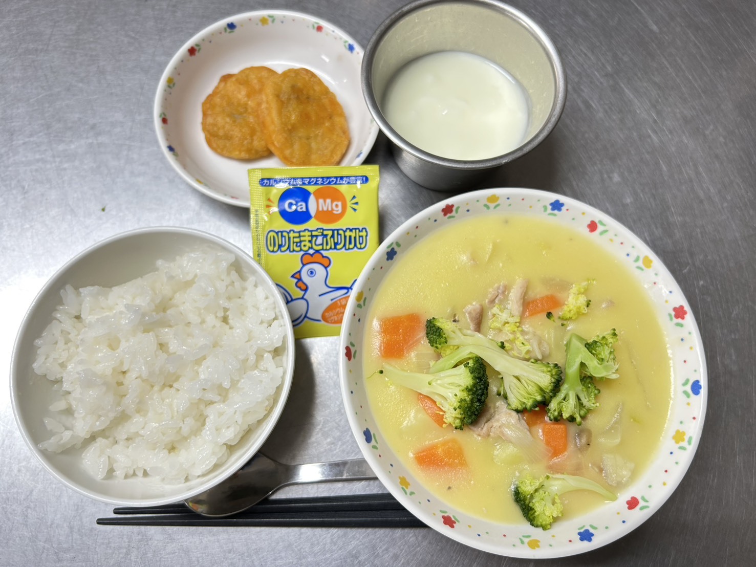 12月24日 御飯、カルシウムふりかけ、クリームシチュー(冬野菜)、チキンナゲット、ヨーグルト