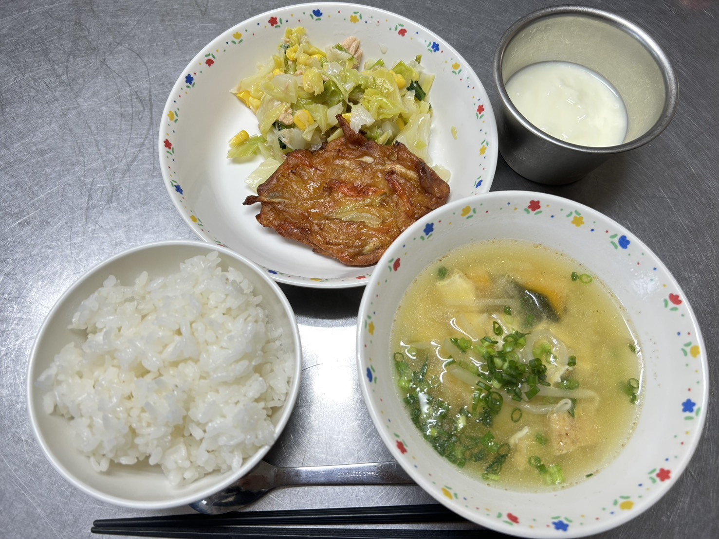 2月19日 御飯、さつま揚げ、キャベツとツナの甘酢サラダ、みそ汁、ヨーグルト
