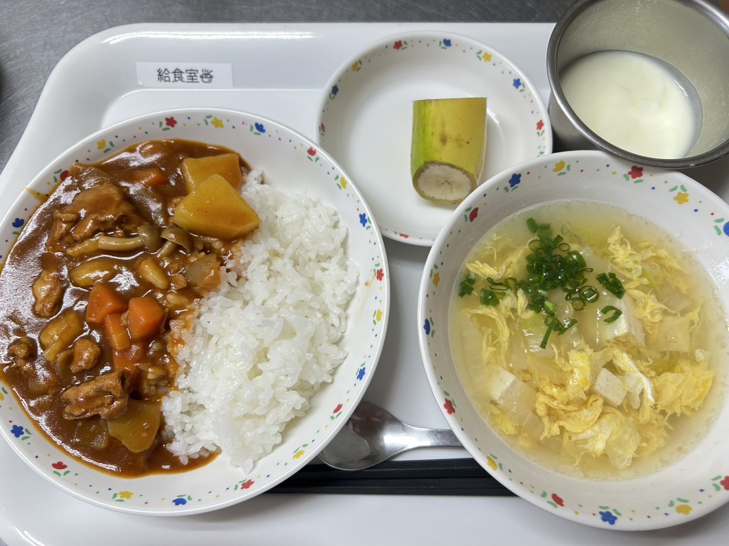 2月20日 ハヤシライス、かき玉汁、ヨーグルト、バナナ