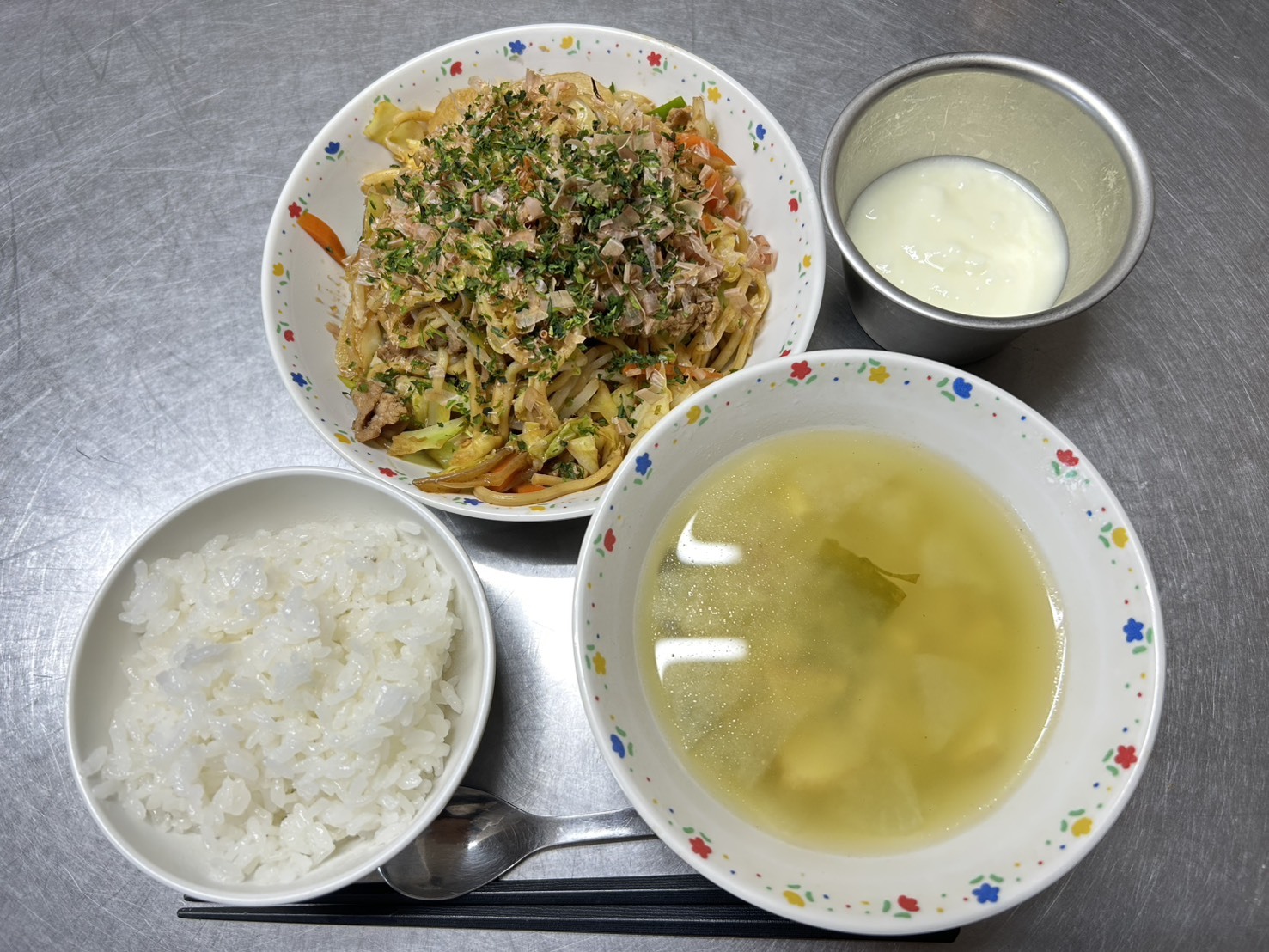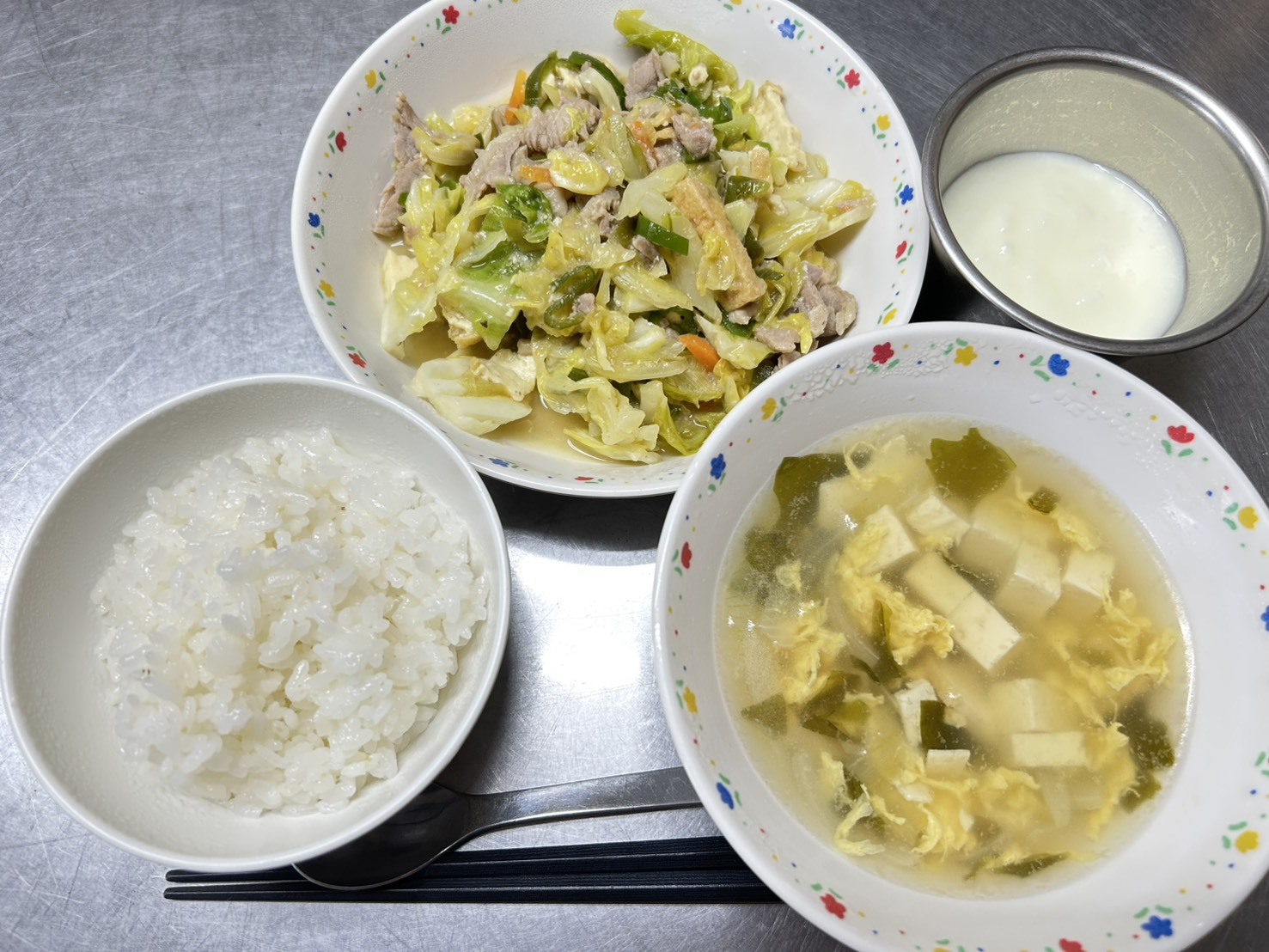 2月28日 御飯、豚肉とキャベツのみそ炒め、卵スープ、ヨーグルト