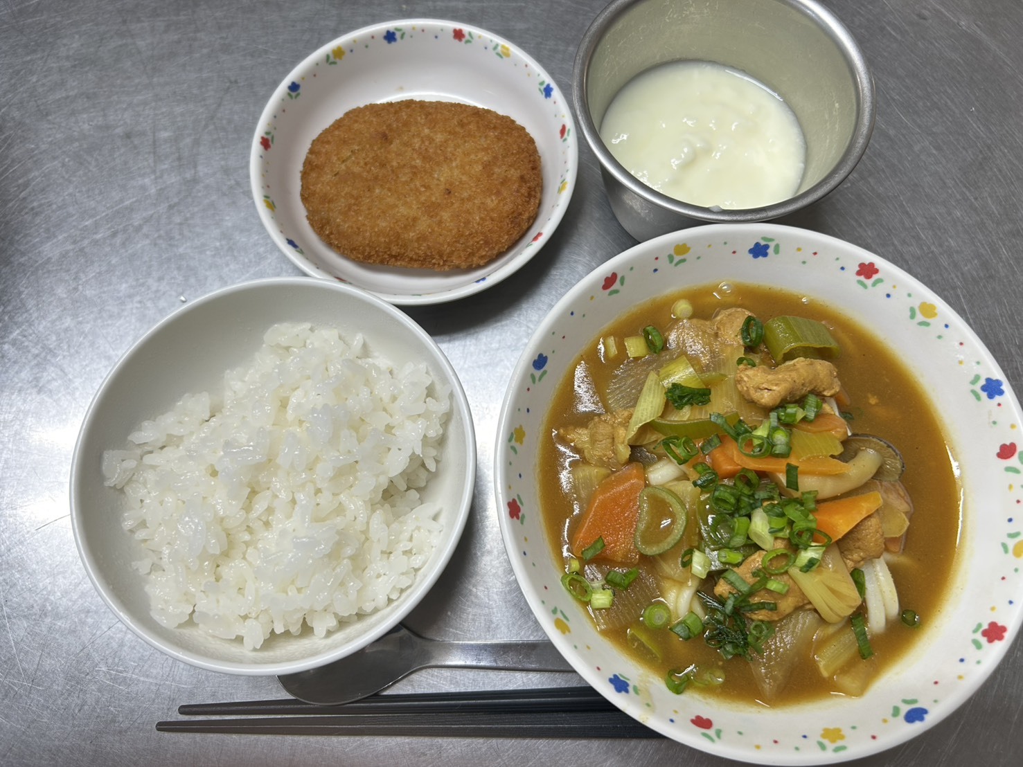 2月24日 御飯、カレーうどん、コロッケ、ヨーグルト