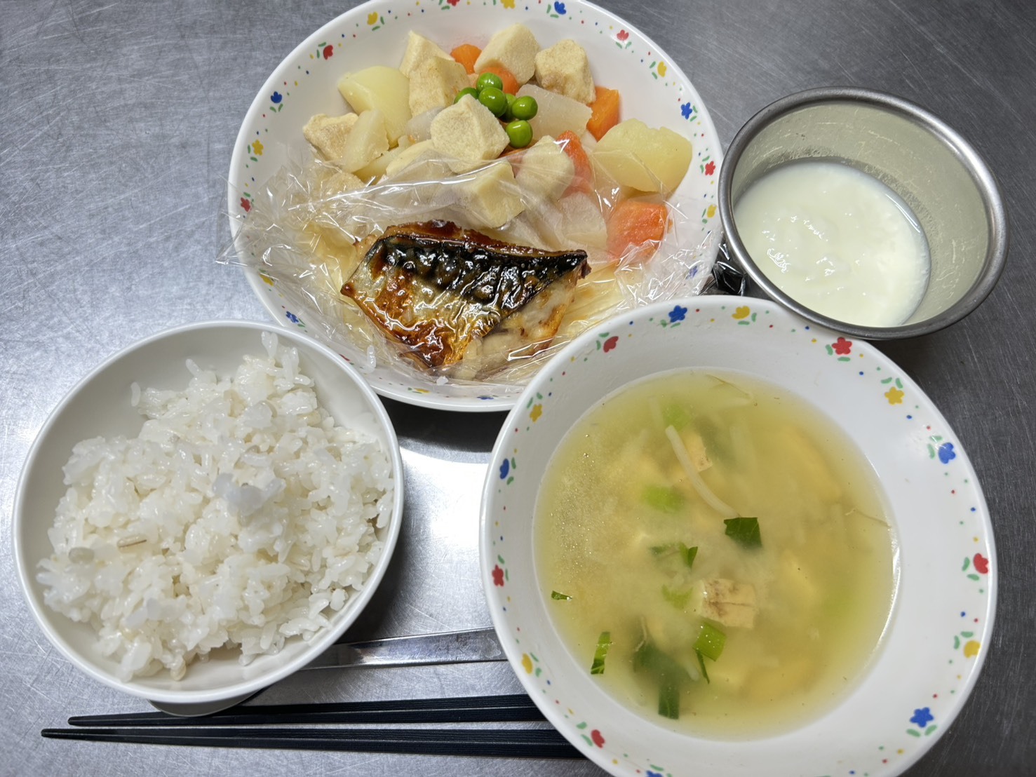 2月26日 麦御飯、魚の甘酢あん、高野豆腐と根菜の煮物、みそ汁、ヨーグルト