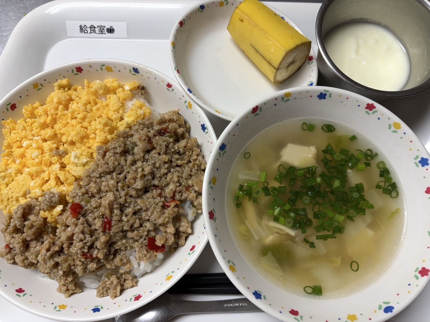 2月27日 ガパオライス風、コンソメスープ、ヨーグルト、バナナ